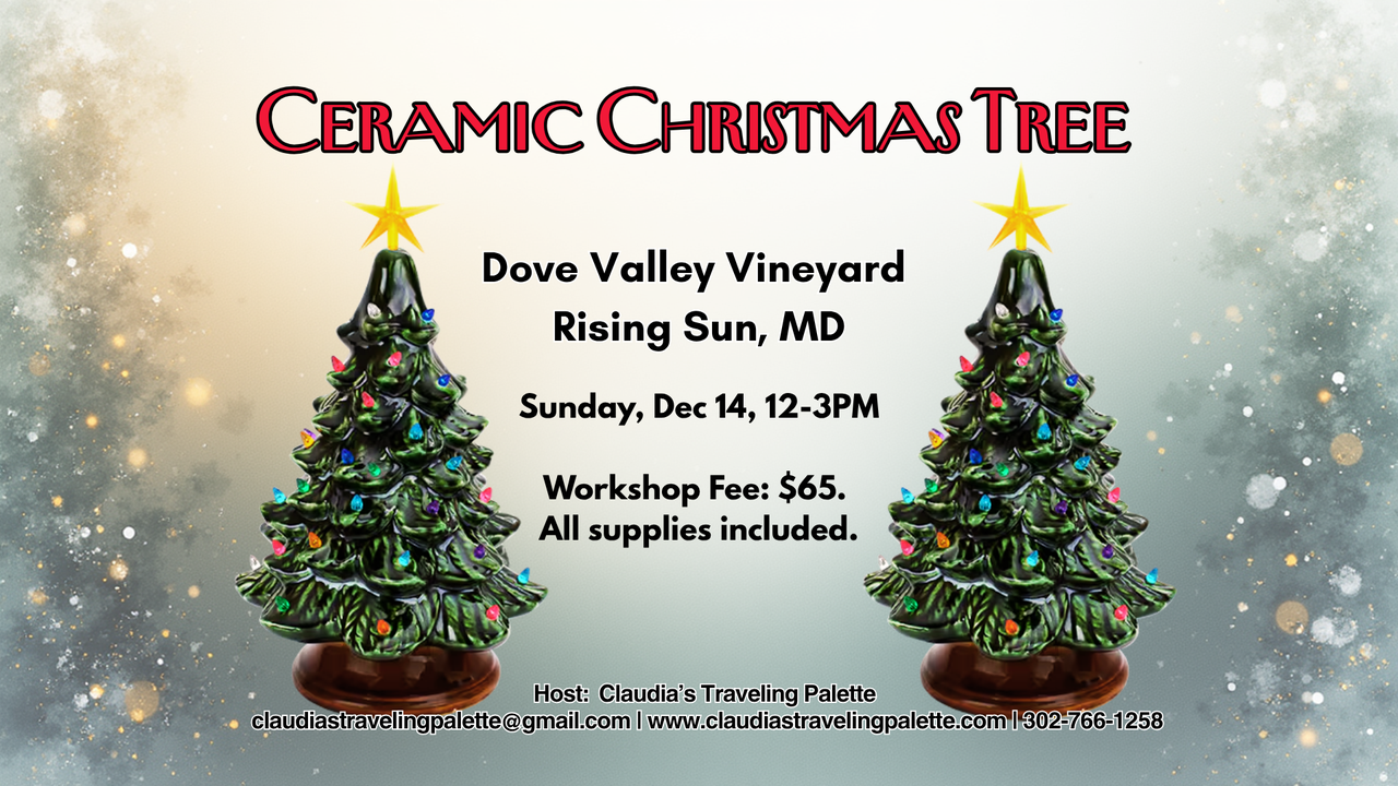 Kick off the holiday season with a classic! Join us at Dove Valley Vineyards to paint and personalize your very own 10 ¼” Ceramic Christmas Tree. Complete with colorful light-up bulbs and a shining topper, this timeless piece will become a cherished part of your holiday décor year after year.