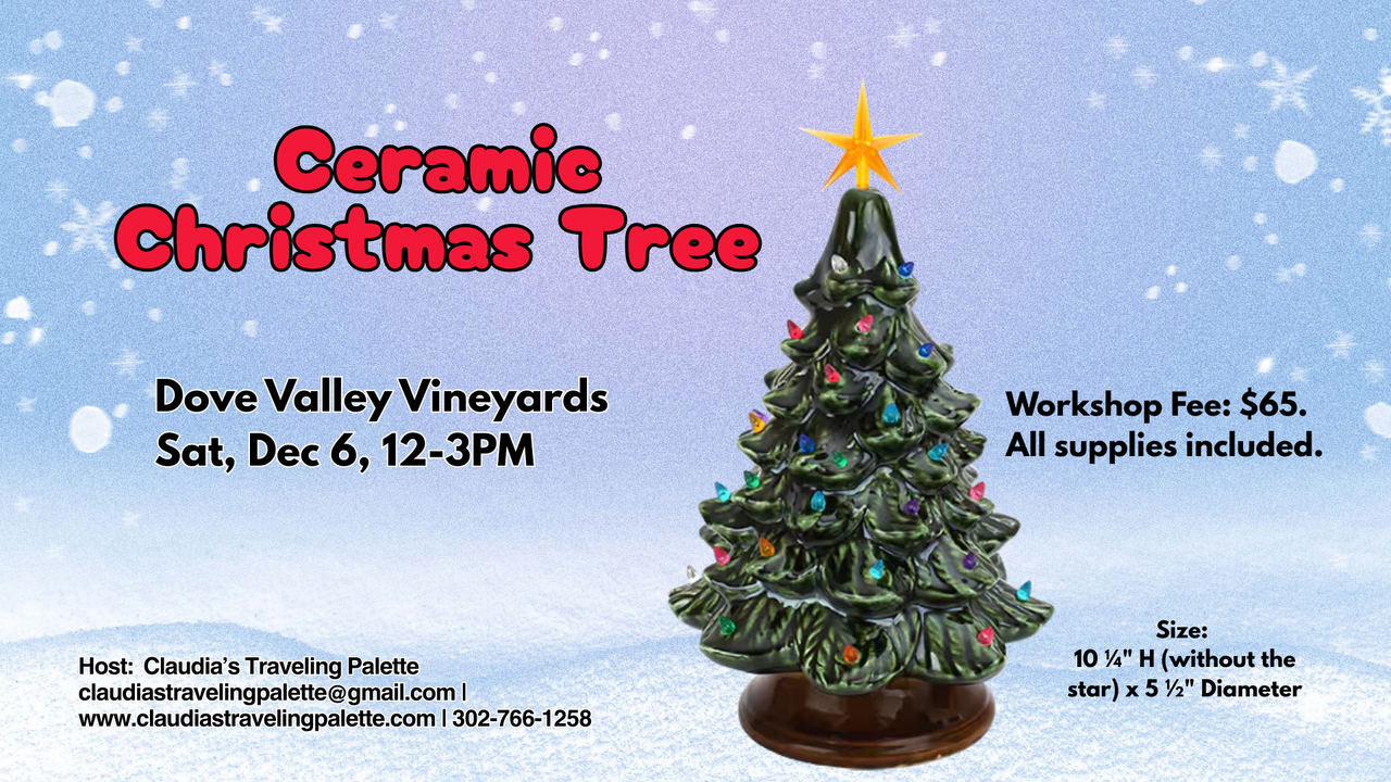 Kick off the holiday season with a classic! Join us at Dove Valley Vineyards to paint and personalize your very own 10 ¼” Ceramic Christmas Tree. Complete with colorful light-up bulbs and a shining topper, this timeless piece will become a cherished part of your holiday décor year after year.