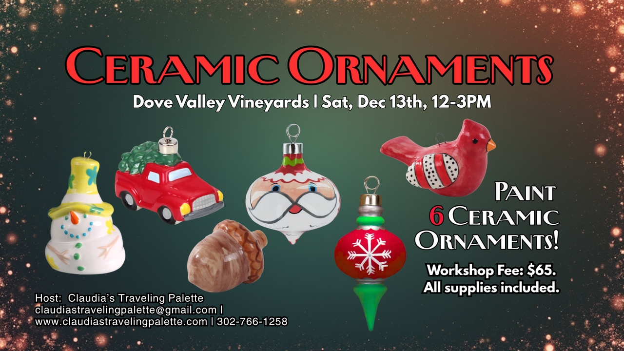 Join us for a fun and festive Ceramic Ornament painting workshop at Dove Valley Vineyards! On Saturday, December 13th, from 12 PM to 3 PM, you’ll have the opportunity to paint six unique ceramic ornaments, including a snowman, car, Santa, and more! The workshop fee is $65, which covers all supplies. This event is hosted by Claudia’s Traveling Palette.