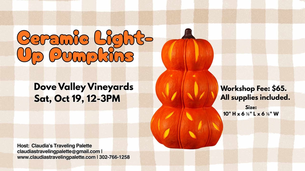 Join us at Dove Valley Vineyards on Sat, Oct 19 | 12–3 PM for a fun fall afternoon of painting your own glowing ceramic pumpkins!