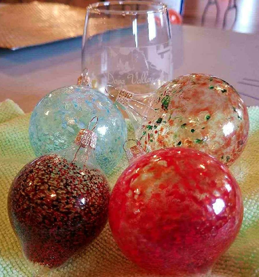 Class includes teacher instruction, equipment and supplies to make 5 glass ornaments, and a complementary glass of your favorite Dove Valley wine! Don’t forget to bring a box to transport your unique ornaments home safely.