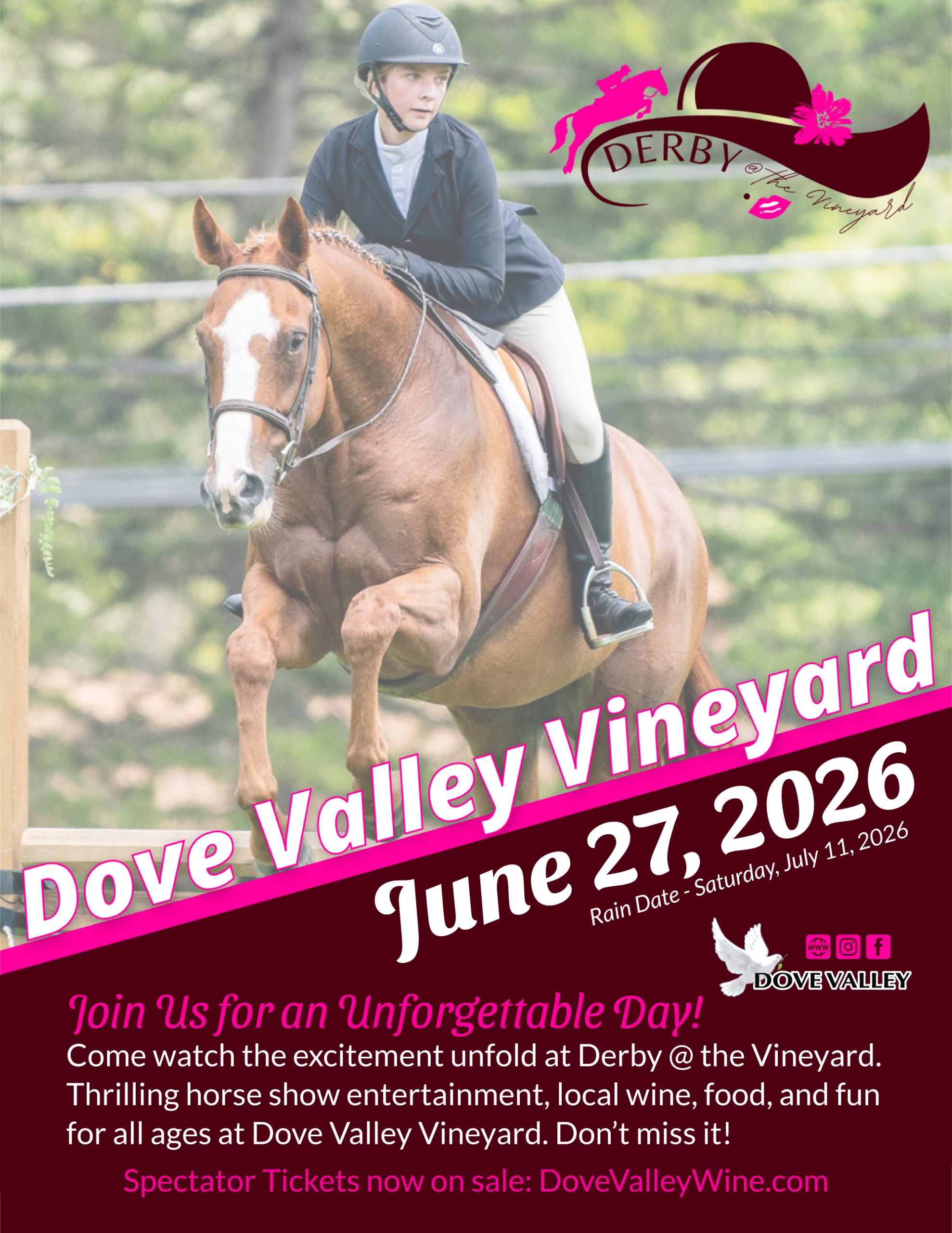 Join us for an unforgettable day at Dove Valley Vineyard for Derby at the Vineyard! Watch the excitement unfold as talented local riders compete in a thrilling horse show set against a beautiful vineyard backdrop.