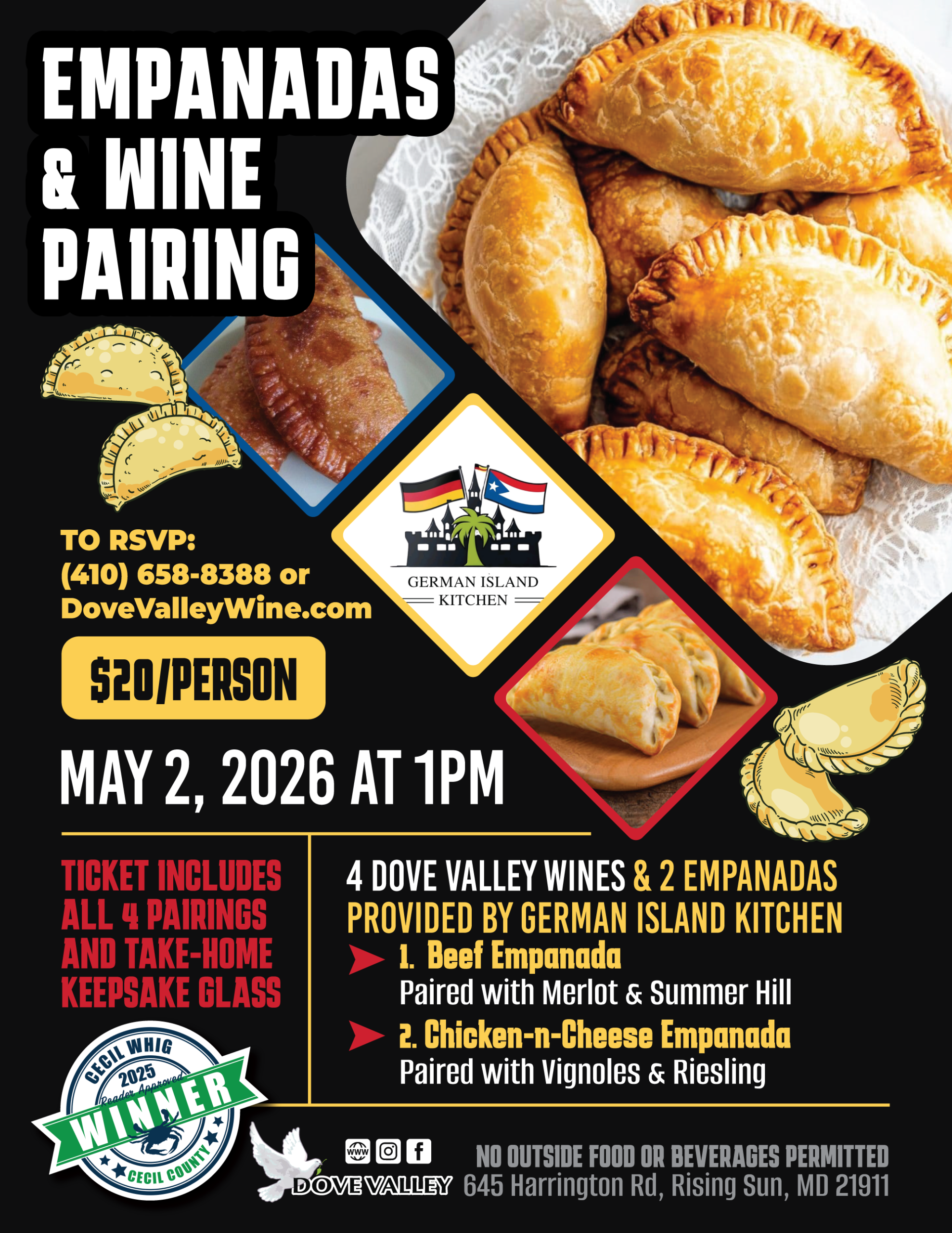 Enjoy 4 Award-Winning Dove Valley Wines perfectly paired with 2 Empanadas provided by German Island Kitchen.