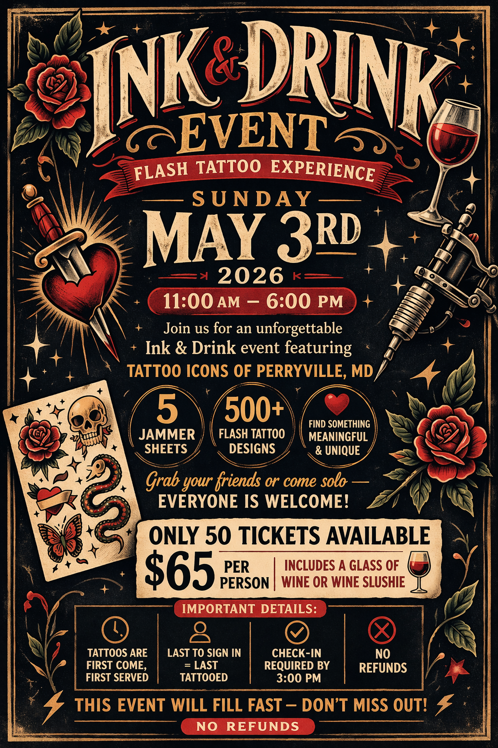 Join us for our Ink & Drink Event featuring Tattoo Icons of Perryville! Choose your tattoo from one of five Jammer Sheets, with over 500 flash tattoo designs available—you’re sure to find something meaningful and perfect for you.