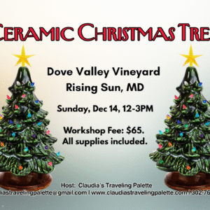 We do not offer refunds for any workshop. If available; a makeup date will be provided. If you’re unable to attend the makeup class OR there is no makeup class available at the time of your cancellation, your product will be made for you to pick up at a later date. If you’re unable to attend a workshop, email us at dovevalleyvineyard@zoominternet.net