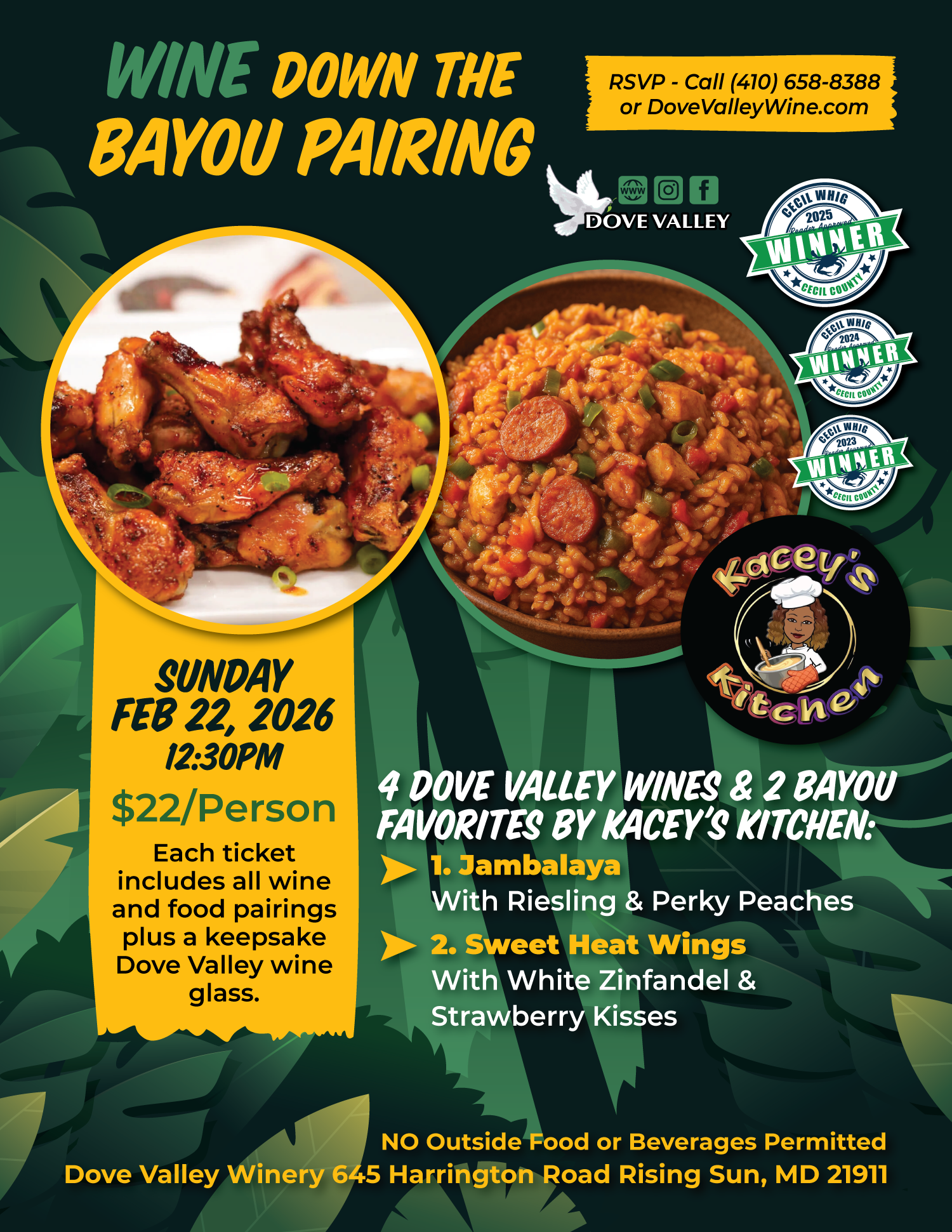 Wine Down The Bayou Pairing* Feb.22nd*12:30pm PURCHASE TICKET + Add to Google Calendar + iCal export 00 days 00 hours 00 minutes 00 seconds Date 22 Feb 2026 Time 12:30 am - 2:30 pm Cost $22 Category Wine Pairings Share this event