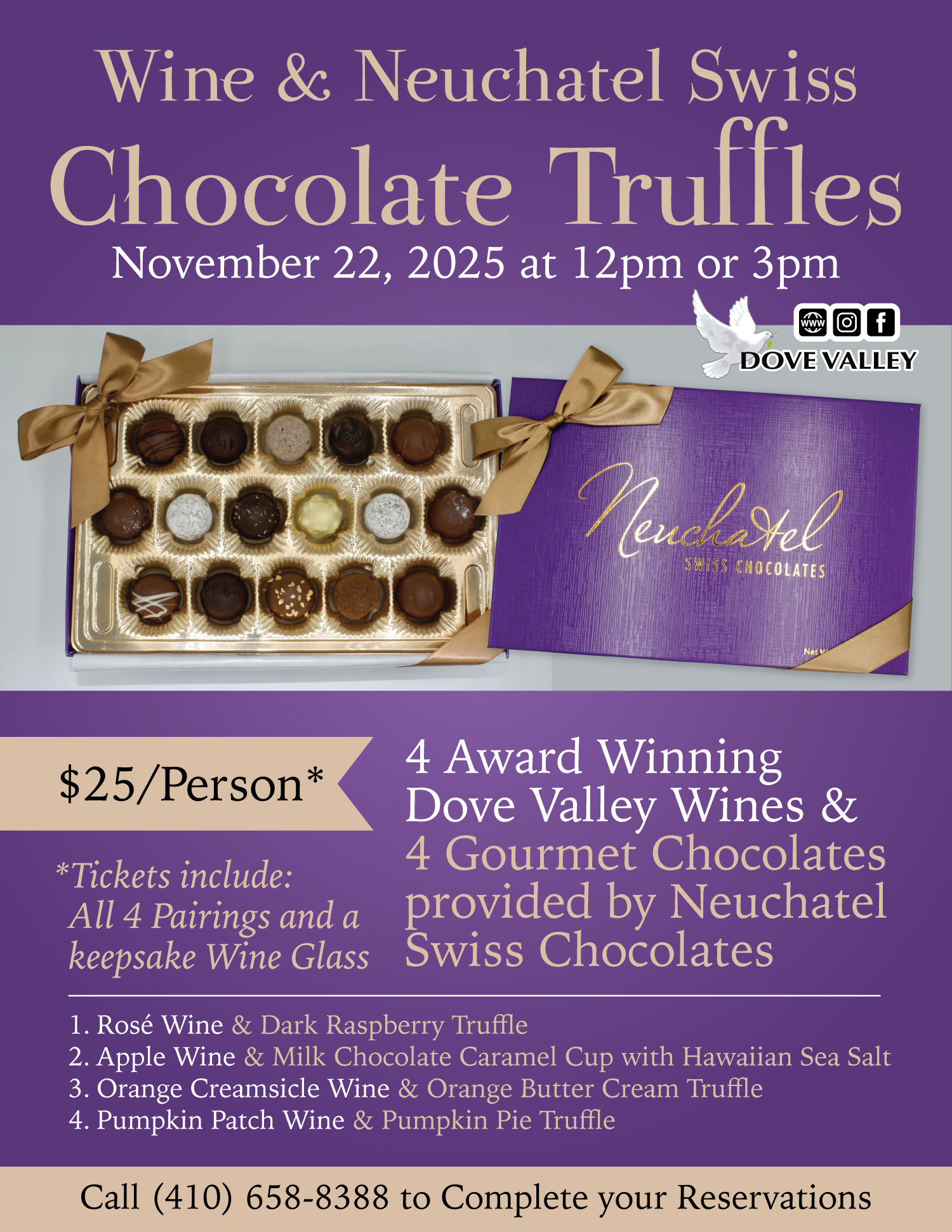 Wine & Neuchatel Swiss Chocolate Truffles *Nov.22nd*12pm PURCHASE TICKET + Add to Google Calendar + iCal export 00 days 00 hours 00 minutes 00 seconds Date 22 Nov 2025 Time 12:00 pm - 2:00 pm Cost $25 Category Wine Pairings Share this event